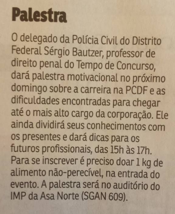 O Delegado Sérgio Bautzer realiza palestra motivacional no próximo domingo, 19/10.
