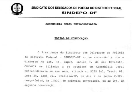 A Assembleia Geral Extraordinária, o Sindicato dos Delegados de Polícia do Distrito Federal...