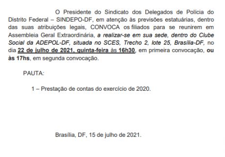O Sindicato dos Delegados de Polícia do Distrito Federal (SINDEPO-DF) convoca todos os seus...