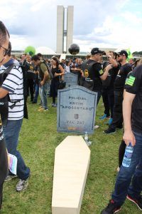Um “cemitério” foi montado no gramado do Congresso, para simbolizar a insatisfação da categoria. Pelas novas regras, para obter aposentadoria integral, o policial terá de contribuir por 49 anos, aposentando-se próximo aos 70 anos de idade, o que excede a previsão de expectativa de vida desses profissionais.